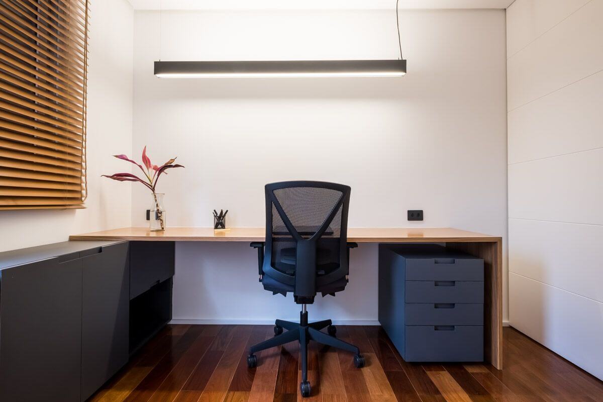 Posicione a mesa de home office próximo a janela do ambiente, pois assim será possível aproveitar a luz natural que entra no cômodo. Isso traz mais disposição para as horas de trabalho e ajuda na economia de energia no imóvel.