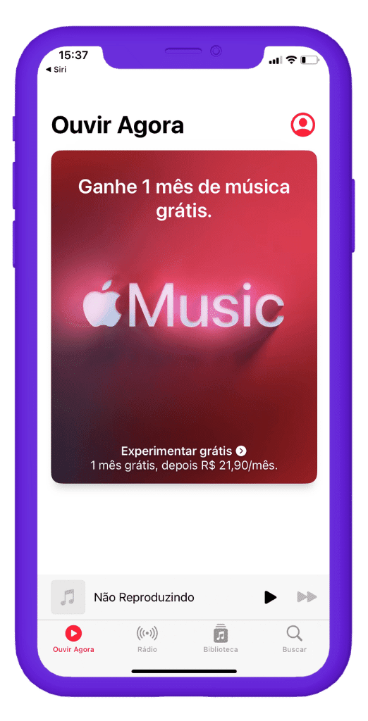 Escutar música no por lá é fácil. Basta abrir o aplicativo Apple Music em seu dispositivo Apple (iPhone, por exemplo), escolher a música que deseja escutar e clicar no botão “play”.