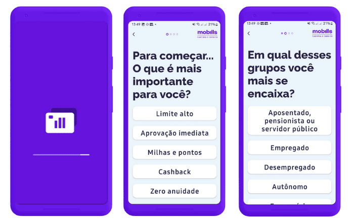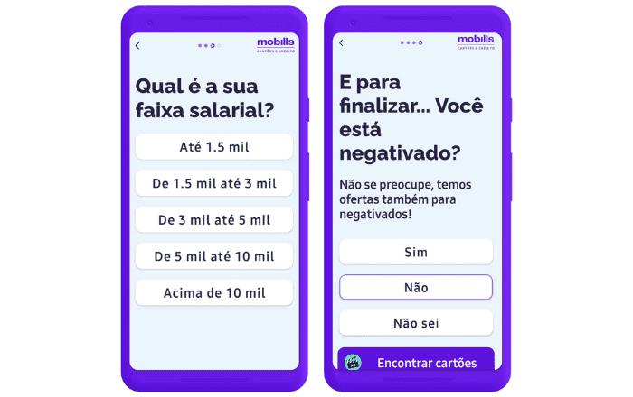Com o aplicativo Mobills Cartões de Crédito é possível, de acordo com o seu perfil, buscar opções de crédito no mercado que combinem com o seu perfil, respondendo algumas perguntas iniciais.