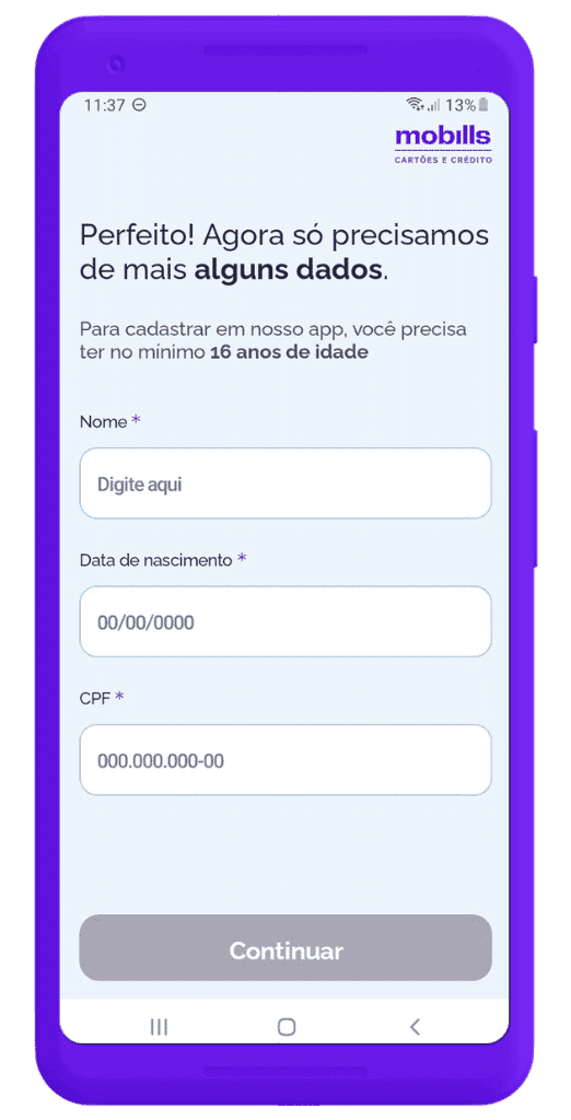 Lembre-se que o aplicativo Mobills Cartões e Crédito é seguro e você pode, de maneira despreocupada, fornecer os dados pedidos.
