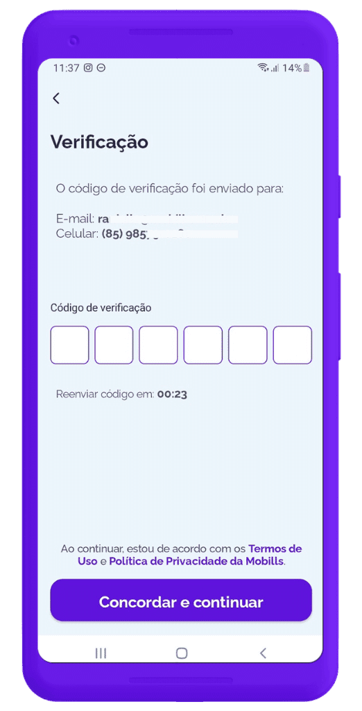 Ao adicionar o código, basta clicar em “Concordar e continuar” para prosseguir e finalizar o cadastro.