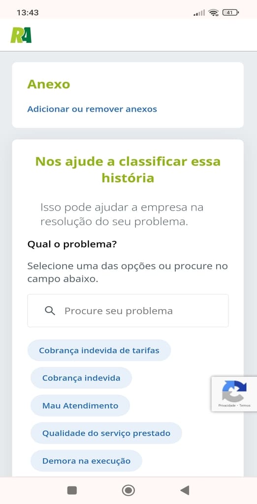 7. Em seguida, é possível incluir um Anexo, podendo ser uma imagem ou documento comprovando sua reclamação; 8. Depois, selecione temas para classificar sua reclamação. Por exemplo: Cobrança indevida, Mau atendimento, Qualidade do serviço prestado, etc.