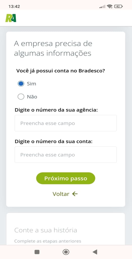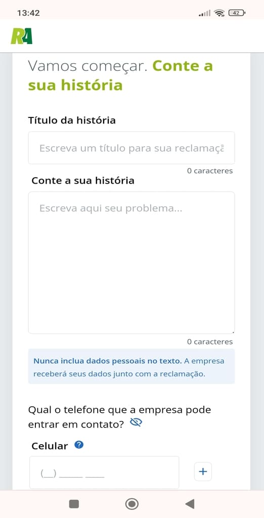 4. Em “Título da história“, coloque o tema da sua queixa; 5. Abaixo em “Conte a sua história”, escreva os fatores que o levaram a reclamar do Bradesco, sem incluir dados pessoais; 6. Preencha o número de celular para que o atendimento do banco possa entrar em contato. Clique em “Próximo passo“