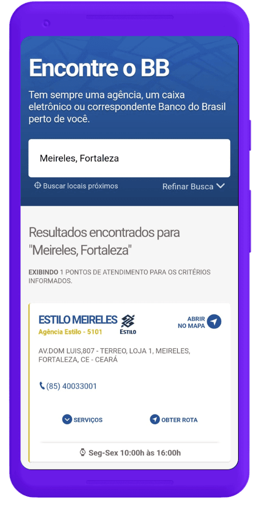 Por ela, basta que você digite a sua cidade ou bairro, que a página lhe indicará uma agência, caixa eletrônico ou correspondente Banco do Brasil perto de você.