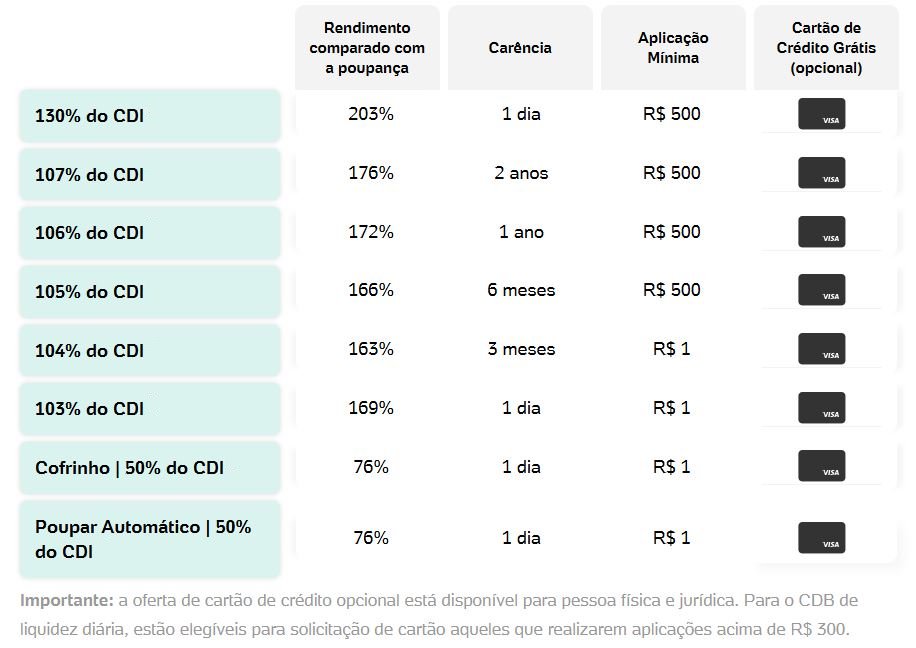 Contudo, a instituição exige que o seu saldo fique sem movimentação no mínimo 30 dias para que o mesmo renda 102% do CDI.