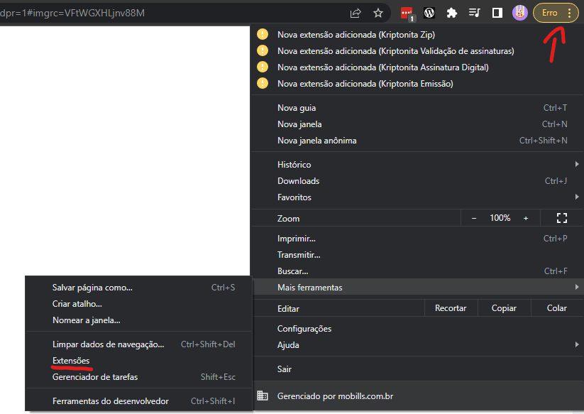 - Depois, vá nos três pontos no canto superior direito > “Mais ferramentas” > “Extensões” (confira a imagem abaixo);