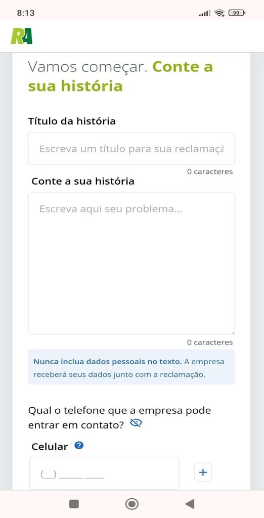3. Em “Título da história“, insira o motivo que o levou a reclamar ao Neon; 5. Já em “Conte a sua história”, dê mais detalhes sobre os acontecimentos; 6. Informe um número de celular para que a equipe do banco entre em contato. Em seguida, clique em “Próximo passo“;