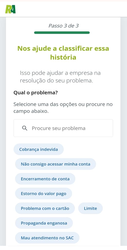 7. Caso tenha imagens ou documentos que comprovem seu problema, basta inseri-los em Anexo; 8. Depois, classifique a reclamação, de acordo com sua queixa. Por exemplo: Cobrança indevida, Não consigo acessar minha conta, Encerramento de conta, etc.;