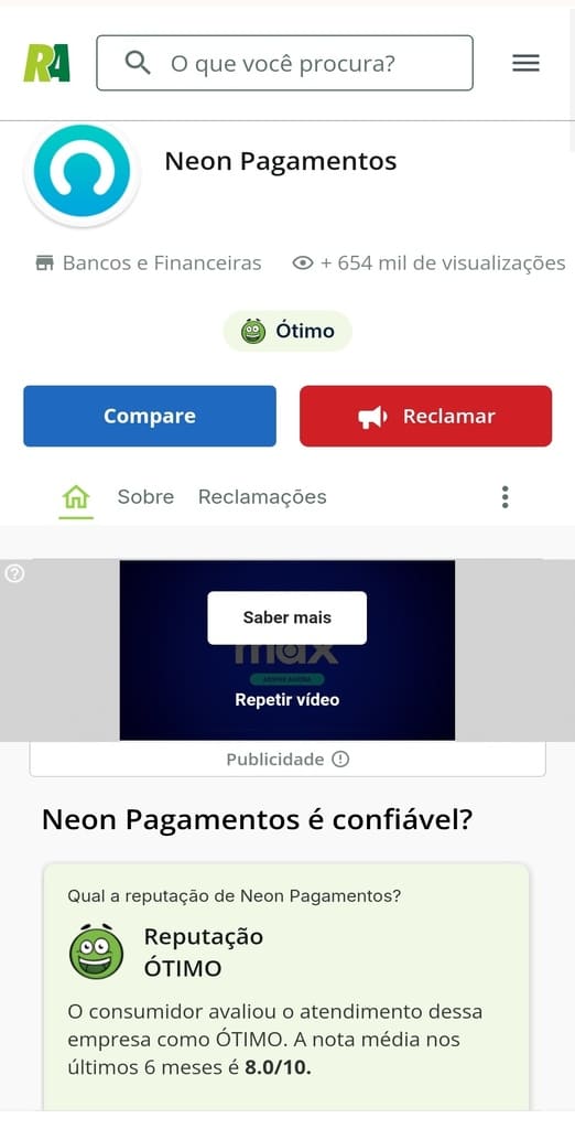 Em outubro de 2024 o Banco Neon no Reclame Aqui está com uma ótima reputação com nota 8.1 de 10, considerada uma fintech confiável.