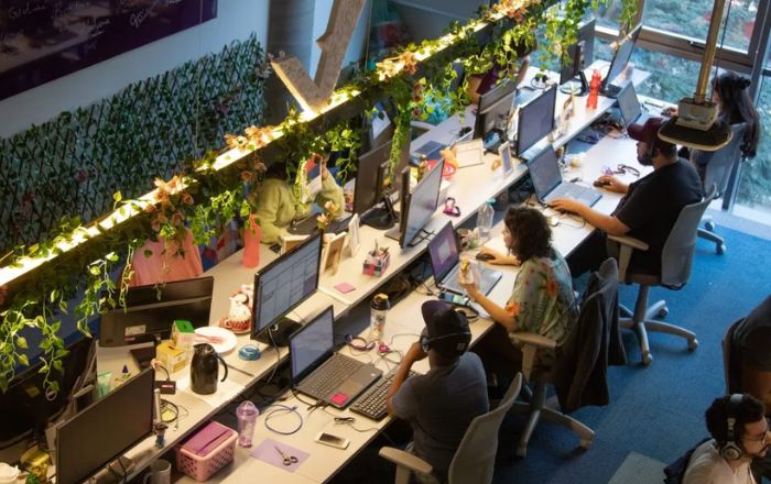 É possível encontrar mesas de trabalho compartilhadas, mas que cada um pode preencher o seu espaço como quiser. Isso para desafiar a burocracia e lentidão de grandes bancos tradicionais.