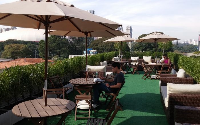Por fim, o último andar é o terraço da sede do Nubank. Quem chega lá, pode aproveitar para desfrutar a vista da cidade sentado em cadeiras de praia.