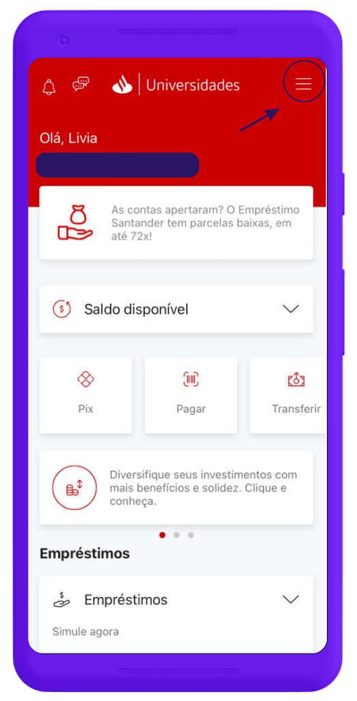 • Acesse o app Santander e abra o menu nas três barrinhas no canto superior direito;
