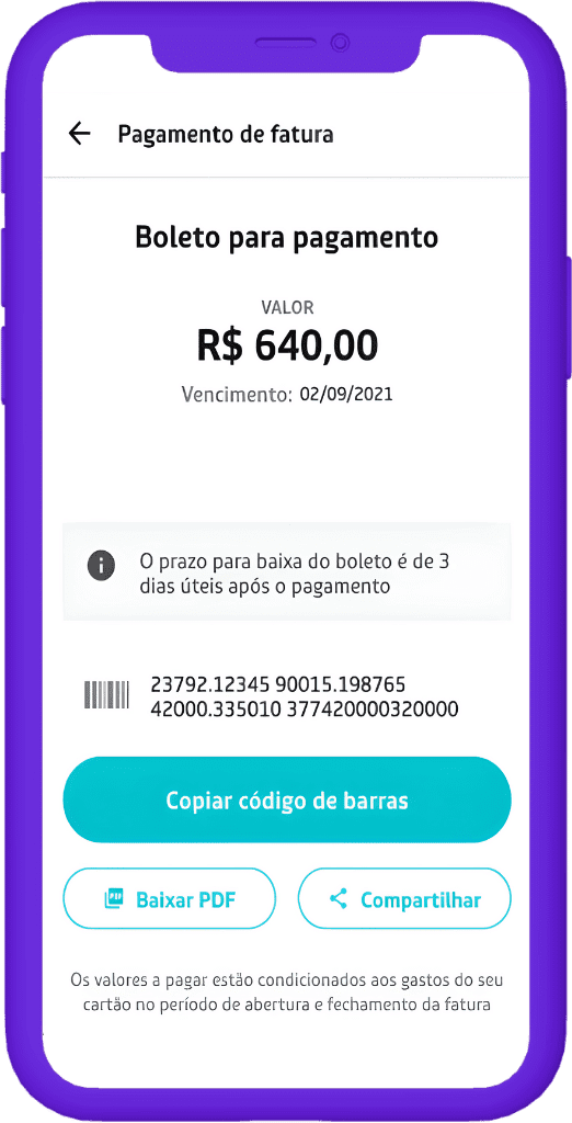5. Para isso, você escolhe “Copiar código de barras”, “Baixar em PDF” ou “Compartilhar“.