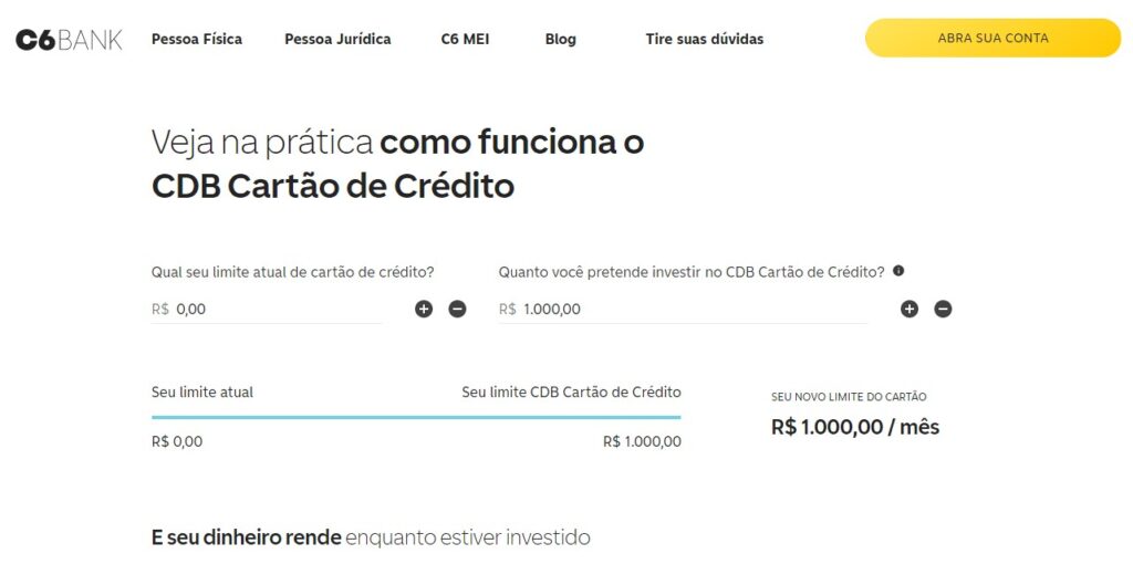 O cartão de crédito C6 Bank libera limite inicial de R$ 100 para investir no CDB e máximo de até R$ 50 mil adicional.