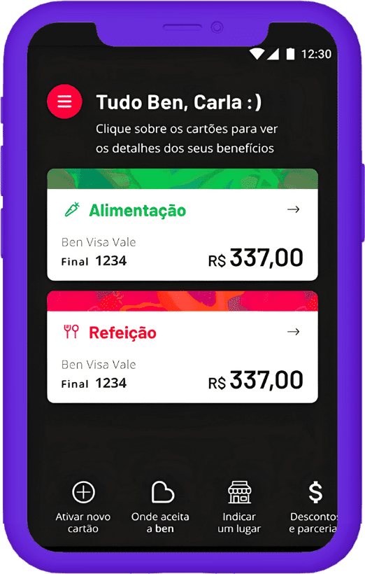 Com o aplicativo Ben Visa Vale, disponível para Android e iOS, os funcionários podem gerenciar o cartão Ben, além de acessar informações e serviços, como: