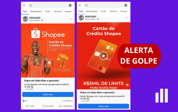 Anúncios do cartão Shopee são falsos. (Imagens do App Facebook)