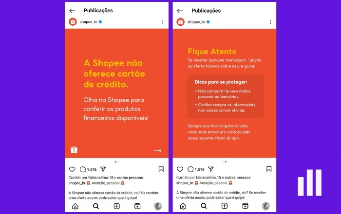 No Instagram oficial da @shopee_br, a empresa fez uma publicação alertando os usuários de que “A Shopee não oferece cartão de crédito” e pelo aplicativo da Shopee é possível conferir os produtos financeiros disponíveis.