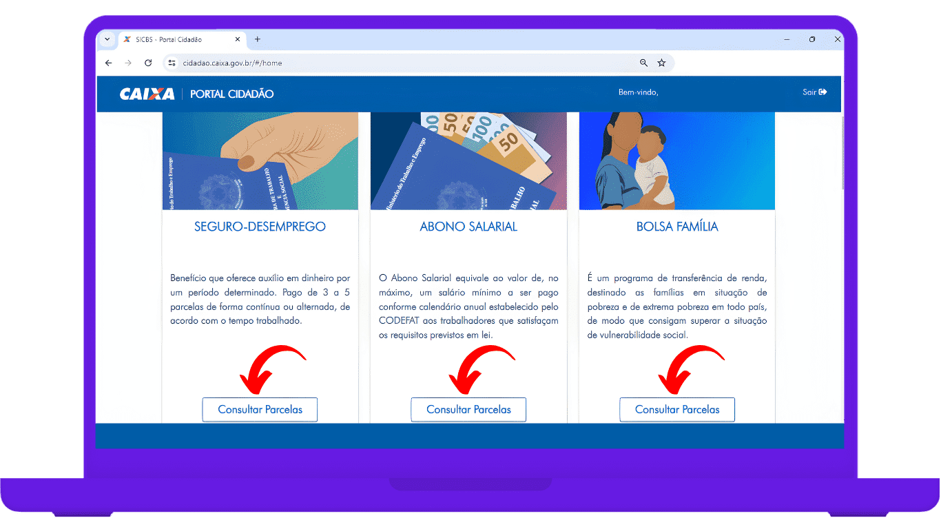 Na tela seguinte aparecerão todos os benefícios sociais e trabalhistas, vá na opção desejada clique no botão “Consultar Parcelas“.