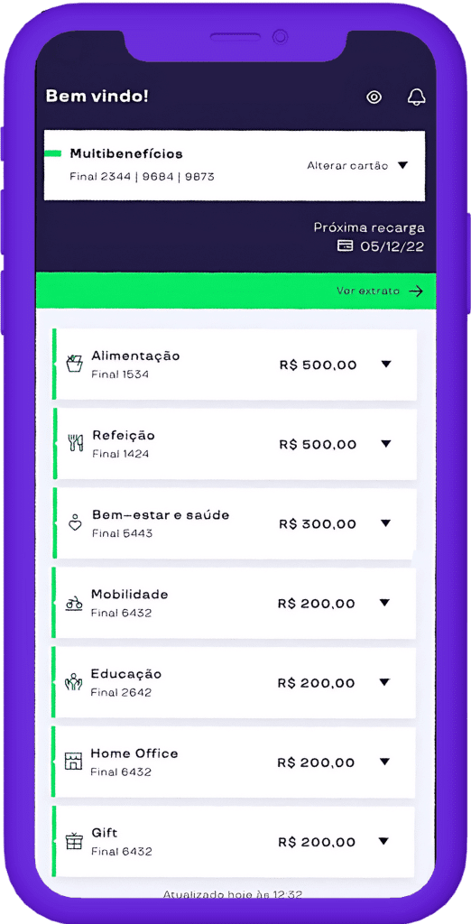 4. E pronto! O saldo de todos os cartões de benefícios corporativos estarão disponíveis na tela inicial.