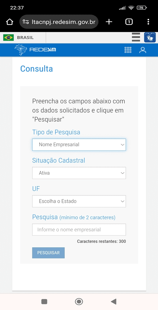 1. Acesse o portal consultacnpj.redesim.gov.br; 2. Faça login com sua conta Gov; 3. Em “Tipo de Pesquisa” selecione a opção desejada: Nome Empresarial, Título do Estabelecimento (Nome Fantasia) ou CNPJ;