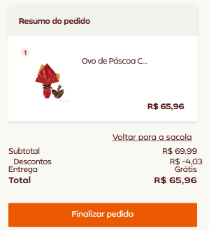 O ovo que custava R$ 69,00 está em oferta por R$ 68,00. Ao pagar com cartão de crédito à vista, ele sai por R$ 68,00 ou parcelado em 2x de R$ 34,00 sem juros. Ou seja, o preço não muda.