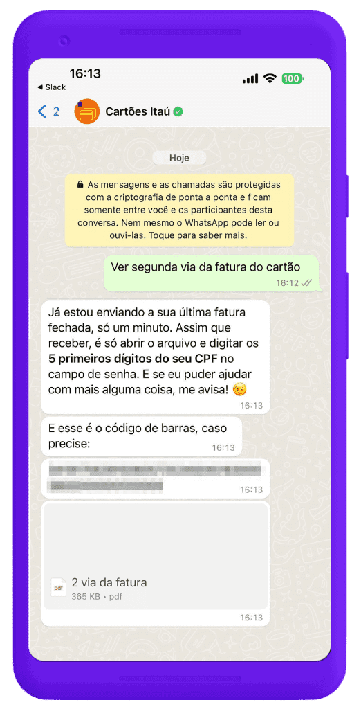 - Envie uma mensagem no WhatsApp do Itaú, solicitando a fatura Extra;