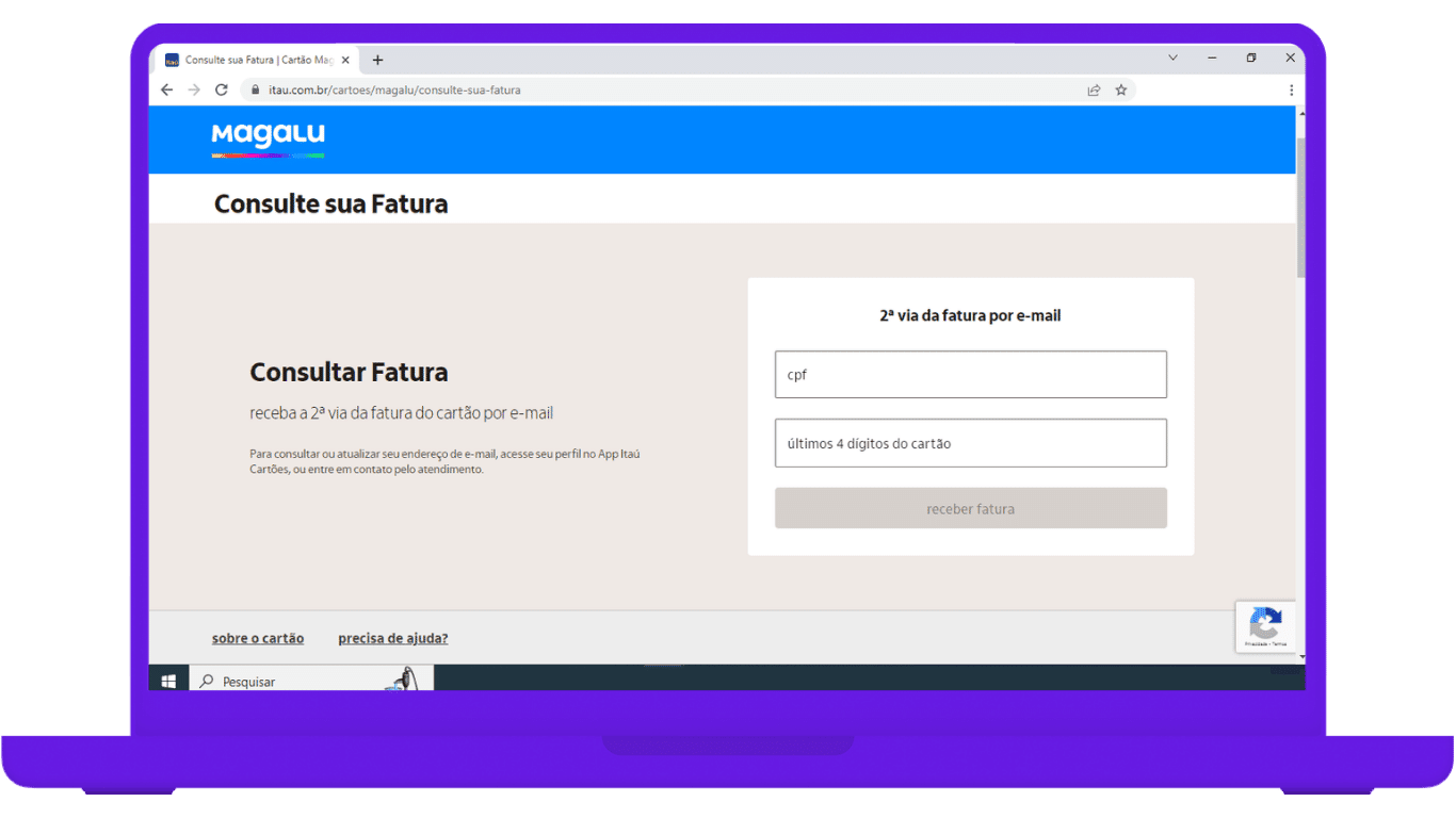 - Na página seguinte é possível consultar a fatura Magazine Luiza pelo CPF e inserindo os 4 últimos números do cartão de crédito.