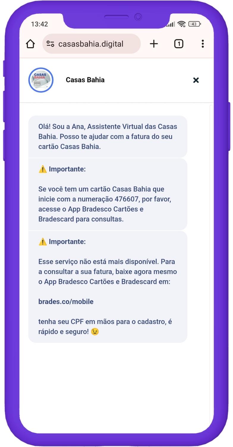⚠️Importante: Esse serviço não está mais disponível. Para consultar sua fatura baixe agora mesmo o App Bradesco Cartões e Bradescard em: brades.co/mobile tenha seu CPF em mãos para o cadastro, é rápido e seguro! 😉 via: casasbahia.digital
