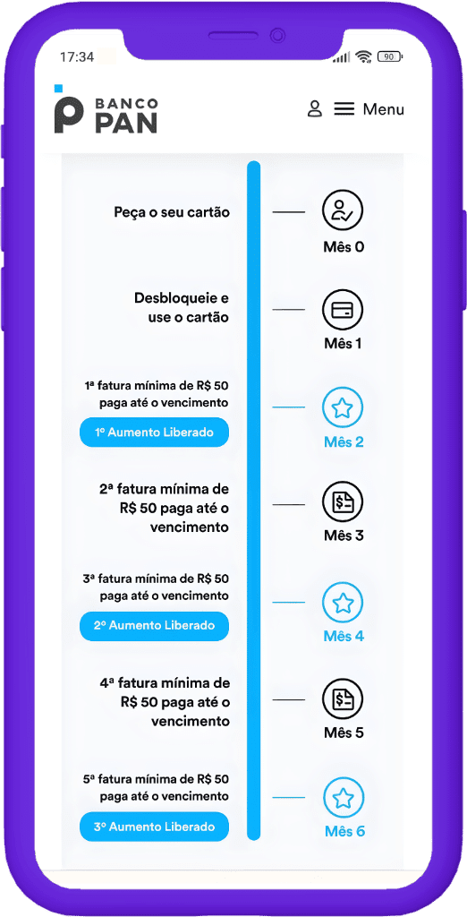 O cartão PAN agora conta com um programa de aumento de limite que permite dobrar o valor concedido inicialmente em apenas 6 meses de uso!