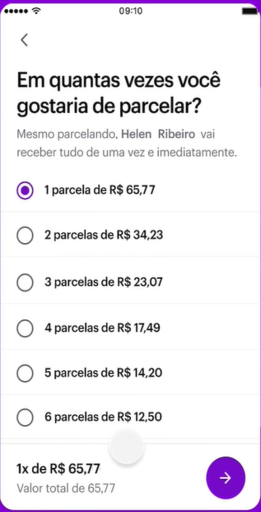 Defina em quantas parcelas deseja pagar e verifique os detalhes da transação;