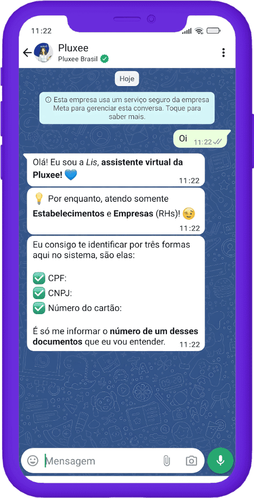 Fale com a assistente virtual pelo WhatsApp da Pluxee, disponível para Estabelecimentos e Empresas:
