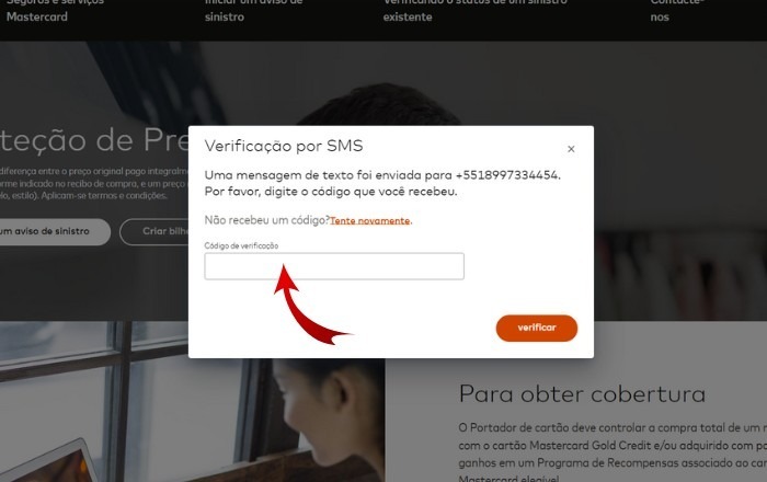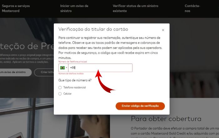 - Coloque o número do seu telefone para confirmar que você é o titular do cartão e clique em “enviar código de verificação”;