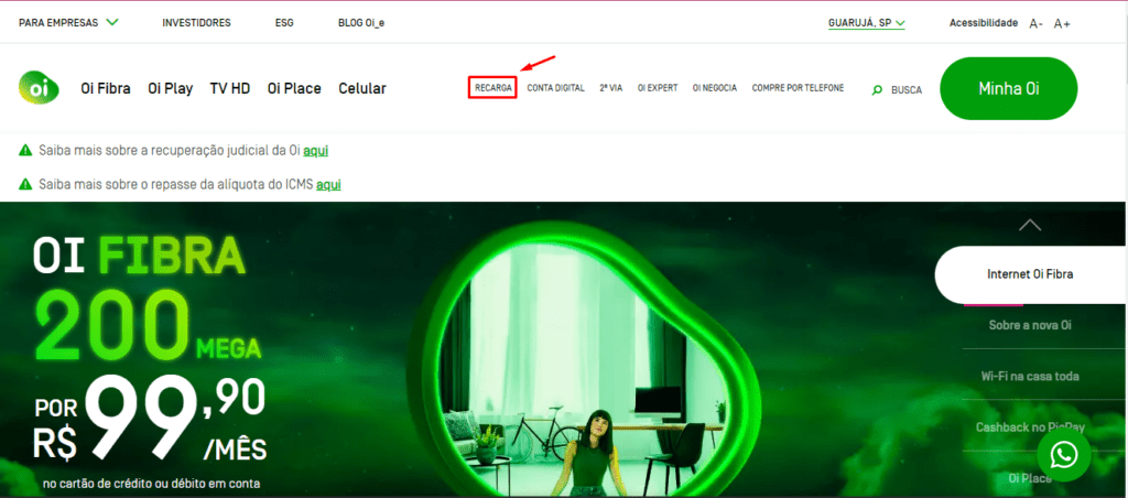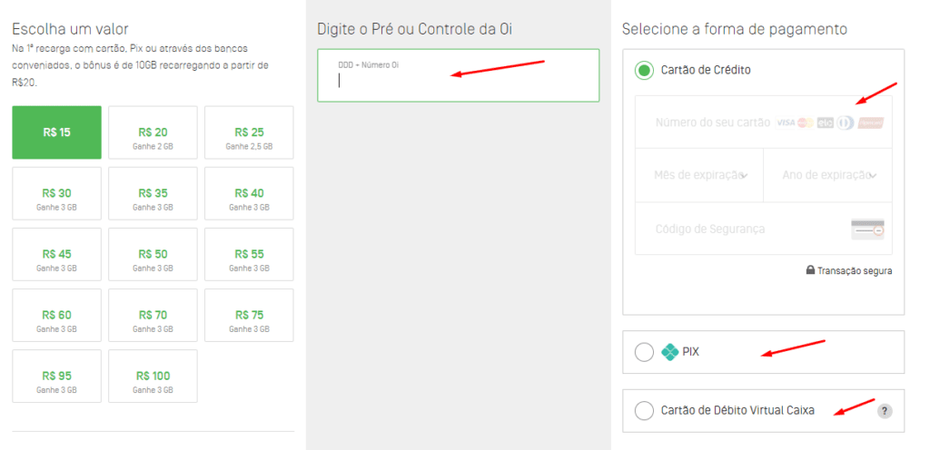 Uma vantagem em fazer a recarga oi usando o cartão de crédito é que o pagamento só será cobrado no fechamento da fatura do cartão.