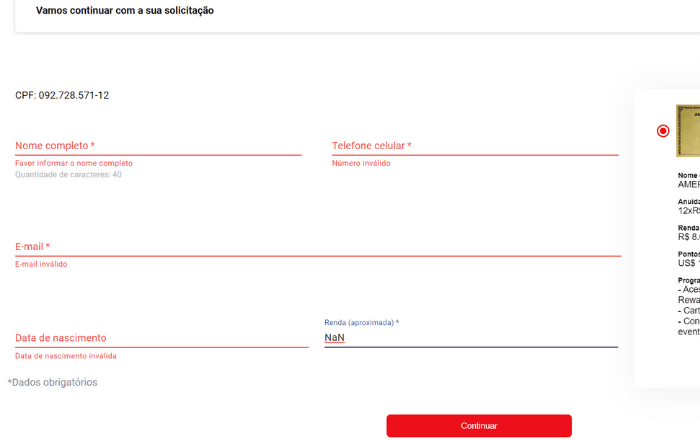 - Forneça os dados necessários, e clique novamente em “Continuar”;