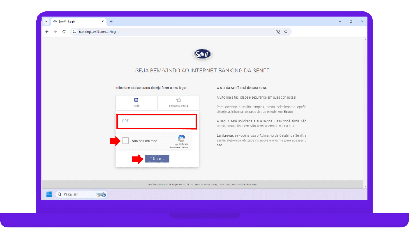 4. Confirme que você não é um robô e clique em “Entrar”;