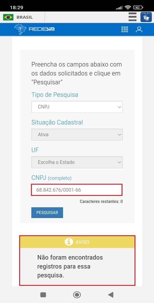 No espaço CNPJ insira os 8 primeiros dígitos sem pontos: 68842676;