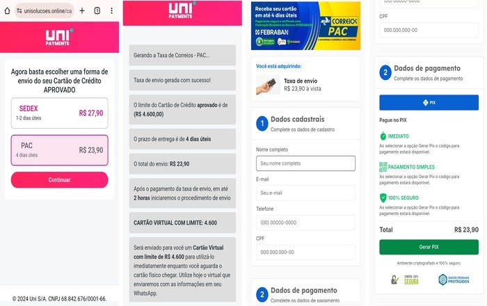 Outro detalhe que observamos nas imagens é a citação “Pagamento seguro e verificado pela Federação Brasileira de Bancos (FREBABAN)“. Consultamos nos sites Busca Banco e Associados da FEBRABAN a empresa “Uni S.A.“, e não há registros da instituição nesta entidade.