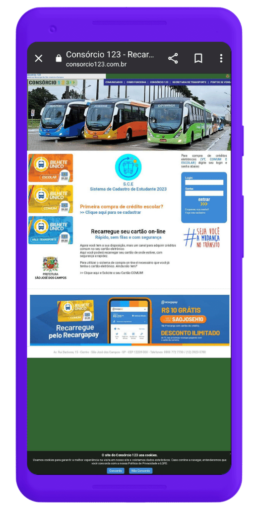Além disso, no site do consórcio 123 você consegue fazer a consulta do vale-transporte e recarregar o bilhete único online.
