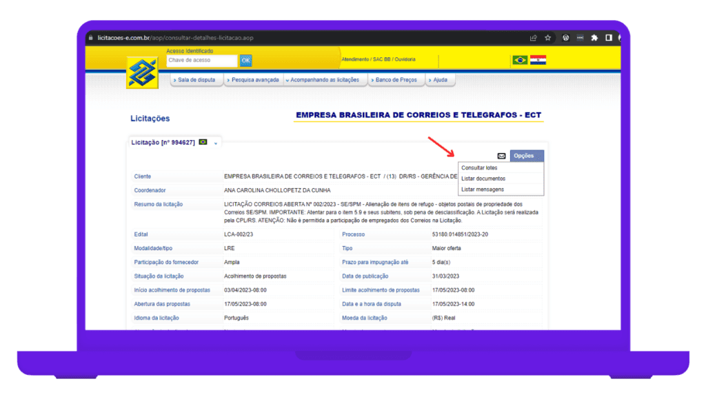Antes de participar, é possível verificar a lista de objetos a serem leiloados, cada um em seus devidos lotes. Pra isso, basta acessar o mesmo site e preencher o campo de “Nº Licitação” com o número 994627: