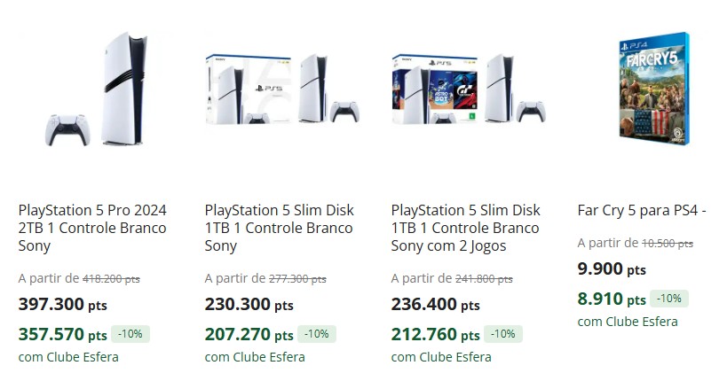 Sim, você pode resgatar um Playstation 5 na Esfera utilizando somente os pontos que você acumulou. Atualmente, existem inúmeras ofertas em atividade envolvendo PS5, tanto consoles quanto jogos, acessórios e gift cards.