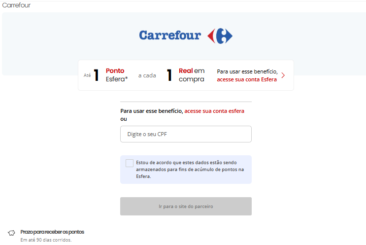 1. Acesse o site da Esfera e faça login, depois busque por Juntar, Lojas Parceiras. Agora na barra de busca digite Carrefour para localizar a loja parceira;