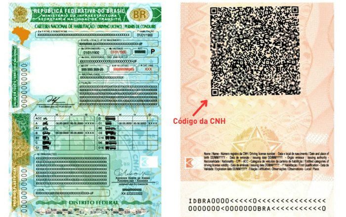 Além disso, é importante não confundir o código da CNH com o número de registro da CNH (que aparece em letras vermelhas – frente do documento), nem com o Número do Formulário CNH (que aparece na vertical, duas vezes – frente do documento).