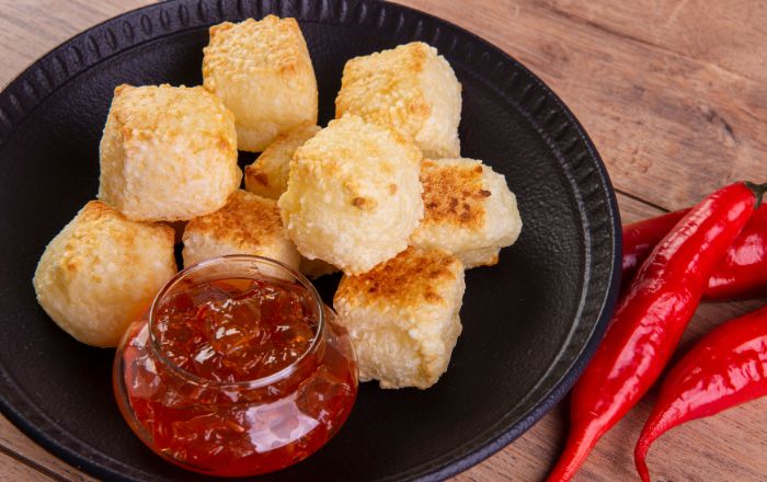 Dadinho de tapioca é um petisco saboroso que acompanha muito bem com um molhinho de pimenta agridoce ou geleia de frutas. Leva em média 30 minutos de preparo e renderá até 40 unidades, sendo uma ótima pedida para sua festa junina.