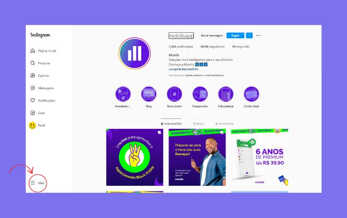 Vá até a opção “Mais”, no canto inferior esquerdo e clique;