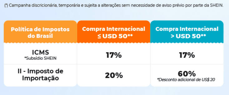 Para compras abaixo de US$ 50, a Shein concederá um desconto incondicional de 17% sobre o valor do produto, o que corresponde ao percentual de ICMS cobrado em compras internacionais. Com a nova regra, após esse desconto, incidirá o imposto de importação (20%). Após a aplicação do imposto de importação, será aplicado, de fato, o ICMS.