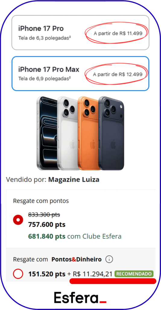 E quem já junta pontos na Esfera tem alguma vantagem? Pode apostar que sim! Na Esfera há uma vitrine virtual repleta de modelos de iPhone desde o mais atual (17 Pro Max) até versões mais antigas (iPhone 13, 14, 15, 16).