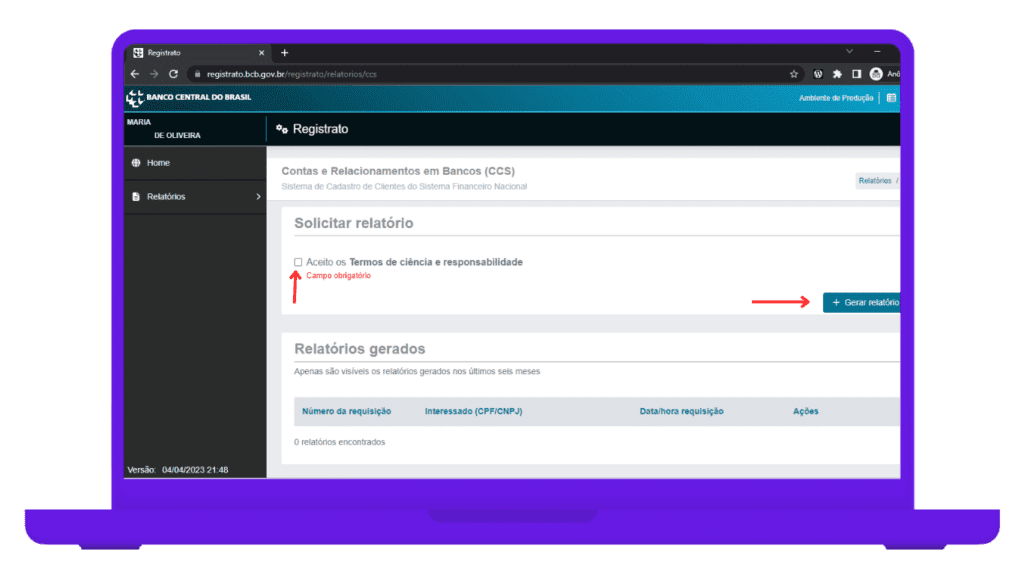 4. Para gerar e ver detalhadamente os detalhes sobre o tipo de relatório selecionado, basta clicar em “Aceito os termos de ciência e responsabilidade” e, em seguida, em “Gerar relatório”;