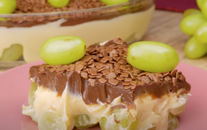 Em um refratário, coloque metade do brigadeiro branco, forre com as uvas, coloque o resto do brigadeiro e despeje a ganache de chocolate por cima. Por fim, leve à geladeira e sirva gelado.
