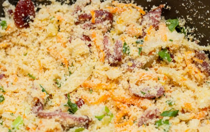 A farofa é um prato tradicional também, e que agrega muito sabor aos alimentos, e pode ser feito como preferir. Com bacon, linguiça, vegetais, ou até mesmo com banana.