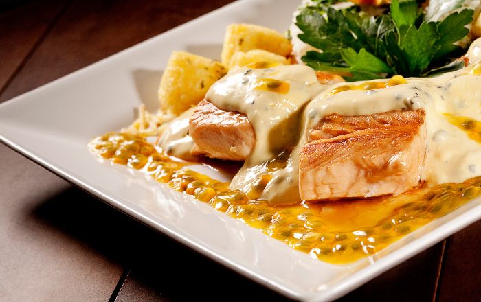 Para servir, basta regar o salmão com o molho de maracujá. Além disso, legumes e frutas grelhadas, ou batatas assadas, são um ótimo acompanhamento.